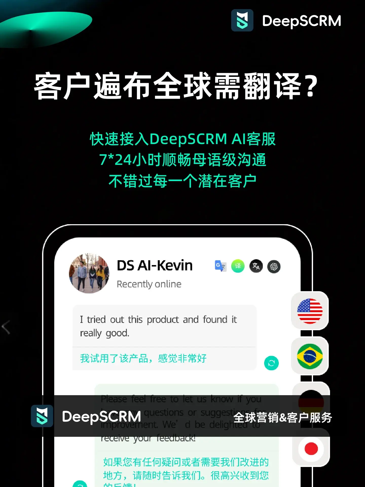DeepSCRM 的解法:AI 实时双向翻译 系统内置了基于大模型的 AI 翻译引擎,直接嵌入在聊天对话框中。