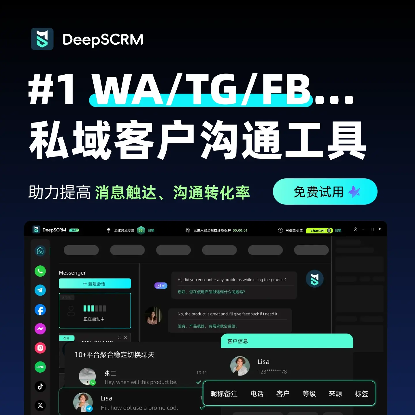 DeepSCRM不仅仅是一个聊天工具,它是专为出海企业打造的 “全渠道聚合营销中台”。针对 X 平台的特性,它从三个维度解决了“接得住”的问题。